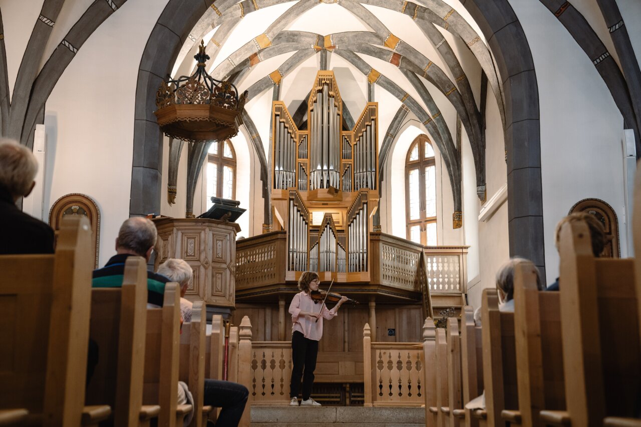 Jeweils vor dem Mittag findet in der Kirche St. Theodul ein Kurzkonzert statt, bei dem barocke Orgelmusik auf ein Werk für ein Soloinstrument trifft. Die Mittagsmusik lädt ein, innezuhalten und die Orgel als Konzertinstrument neu zu entdecken.